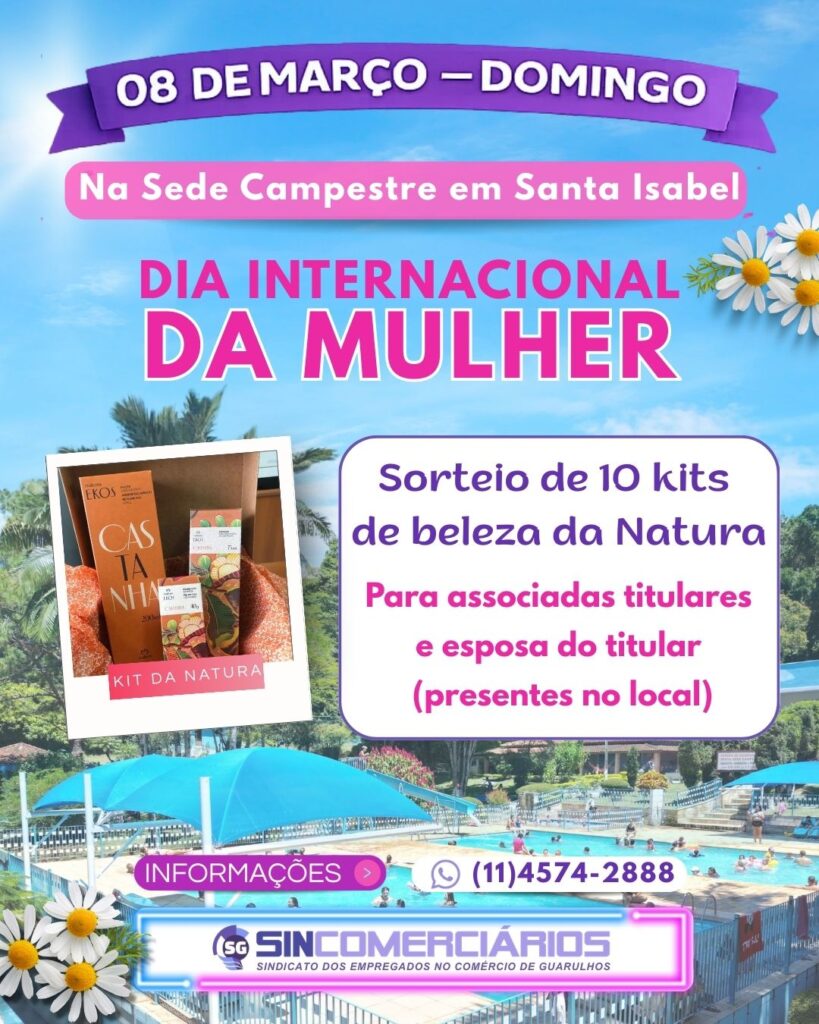 No próximo domingo, 08 de março, Dia Internacional da Mulher, vamos realizar o sorteio de 10 kits de beleza da Natura exclusivos para as associadas que estiverem presentes na nossa Sede Campestre, em Santa Isabel.