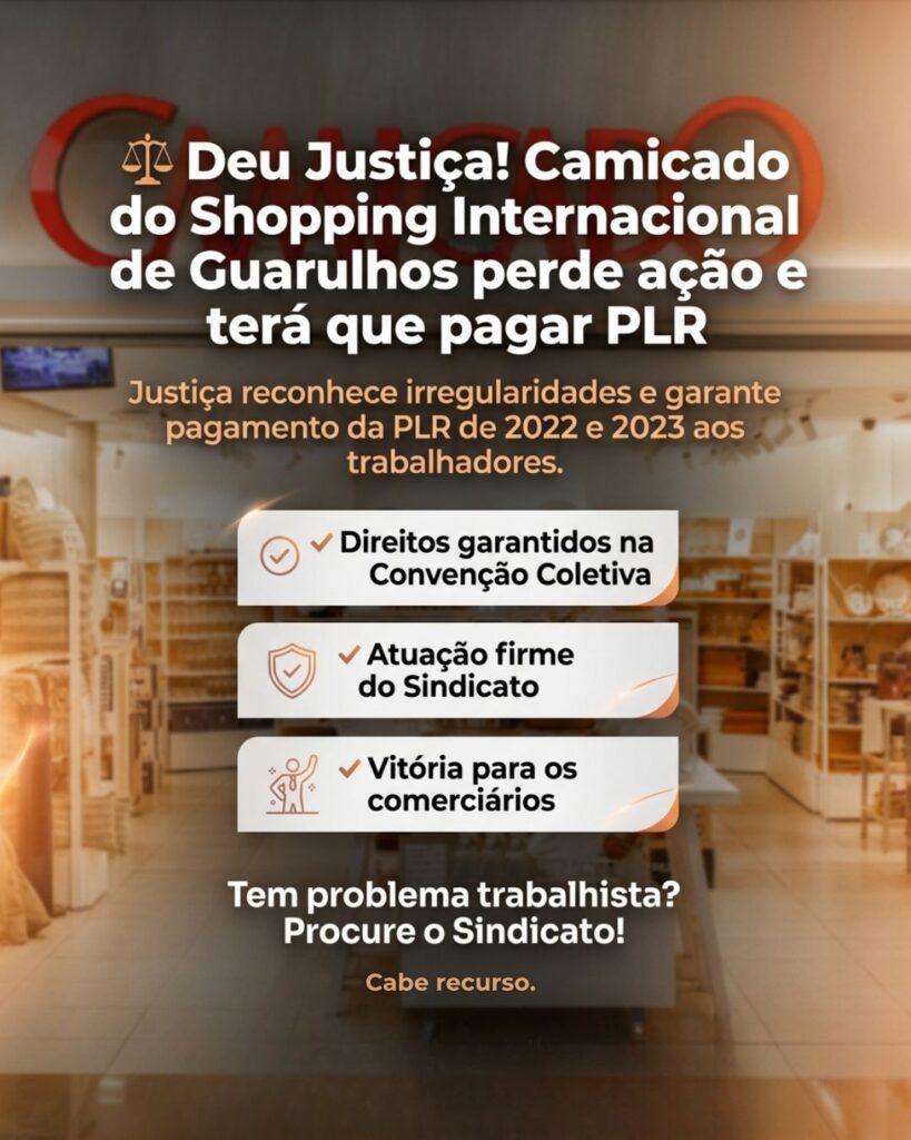 A Camicado do Shopping Internacional de Guarulhos foi condenada por não cumprir corretamente a obrigação de implantar e pagar a Participação nos Lucros e Resultados (PLR), como determinam as Convenções Coletivas da categoria.