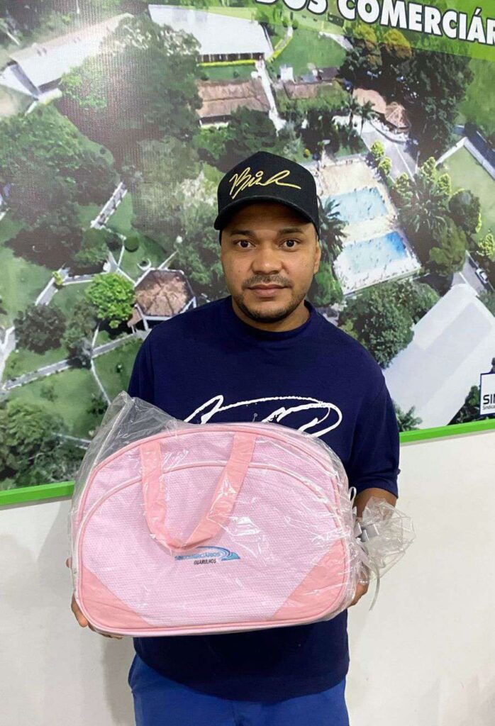 O Valdinei Venâncio Dias, esposo da associada Karla Lopes de Andrade, esteve na sede sindical para retirar o kit da pequena Helena Lopes de Andrade Dias, garantindo o enxoval que representa o cuidado do Sindicato com as mamães e papais comerciários.