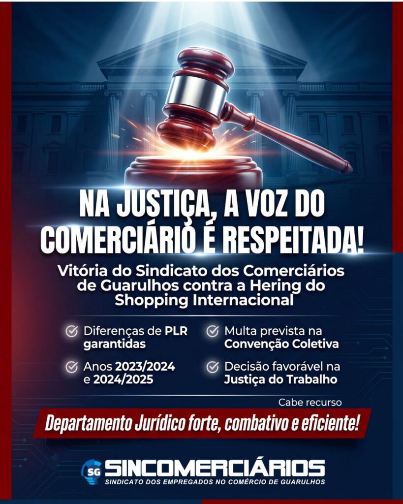 No final deste mês de fevereiro, a 6ª Vara do Trabalho de Guarulhos condenou a Loja Hering do Shopping Internacional de Guarulhos ao pagamento das diferenças de PLR referentes aos anos 2023/2024 e 2024/2025, além da multa prevista nas Convenções Coletivas.