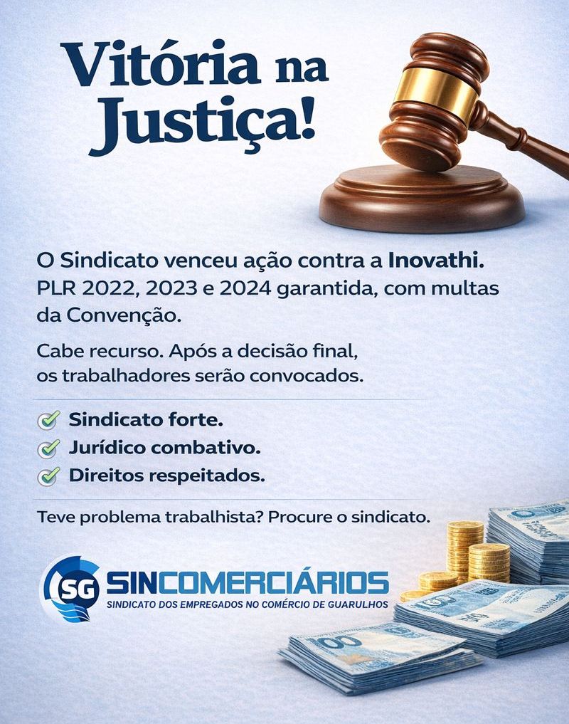 Vencemos mais uma ação judicial. A Justiça condenou a empresa Inovathi Participações ao pagamento da PLR dos anos de 2022, 2023 e 2024, além das multas previstas na Convenção Coletiva, garantindo um salário normativo por ano para cada trabalhador beneficiado.